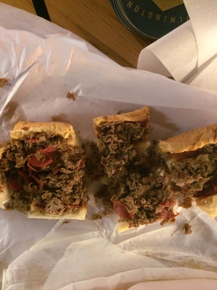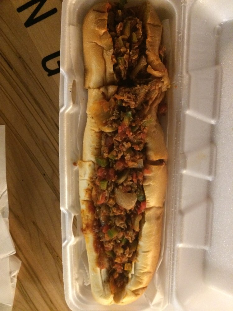 Sandwich made with minced seasoned meat cooked inside of a casing.